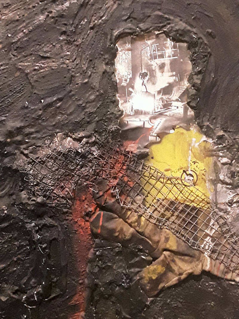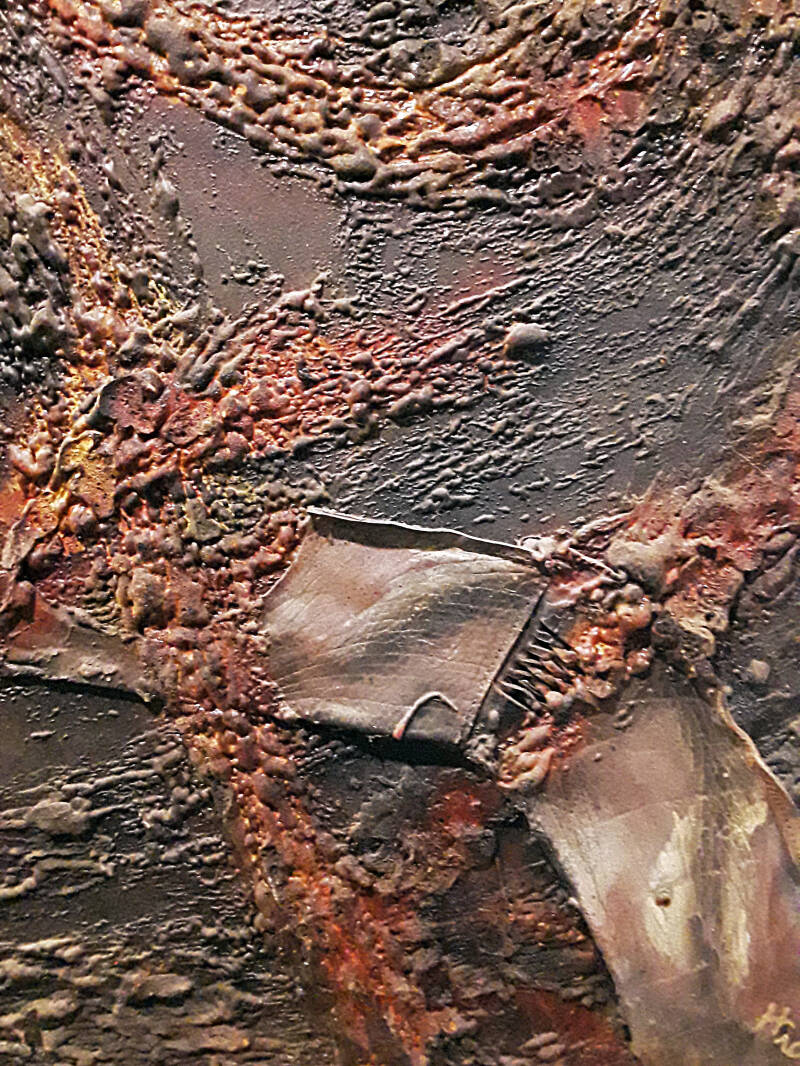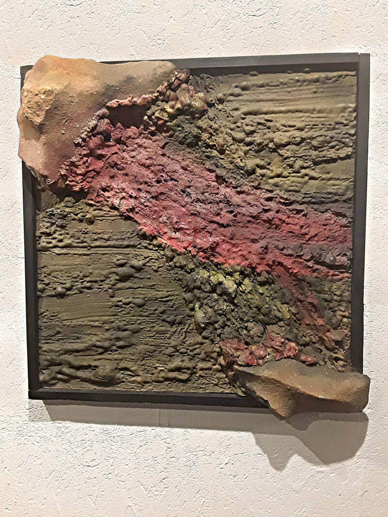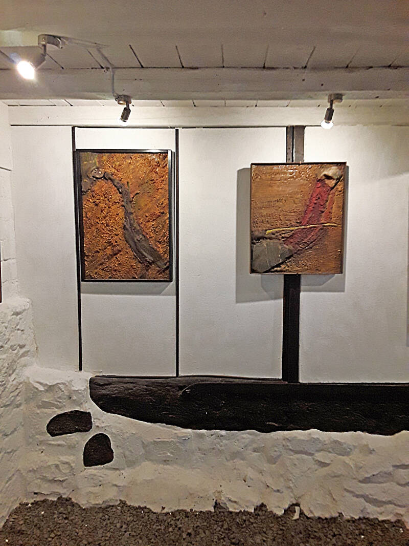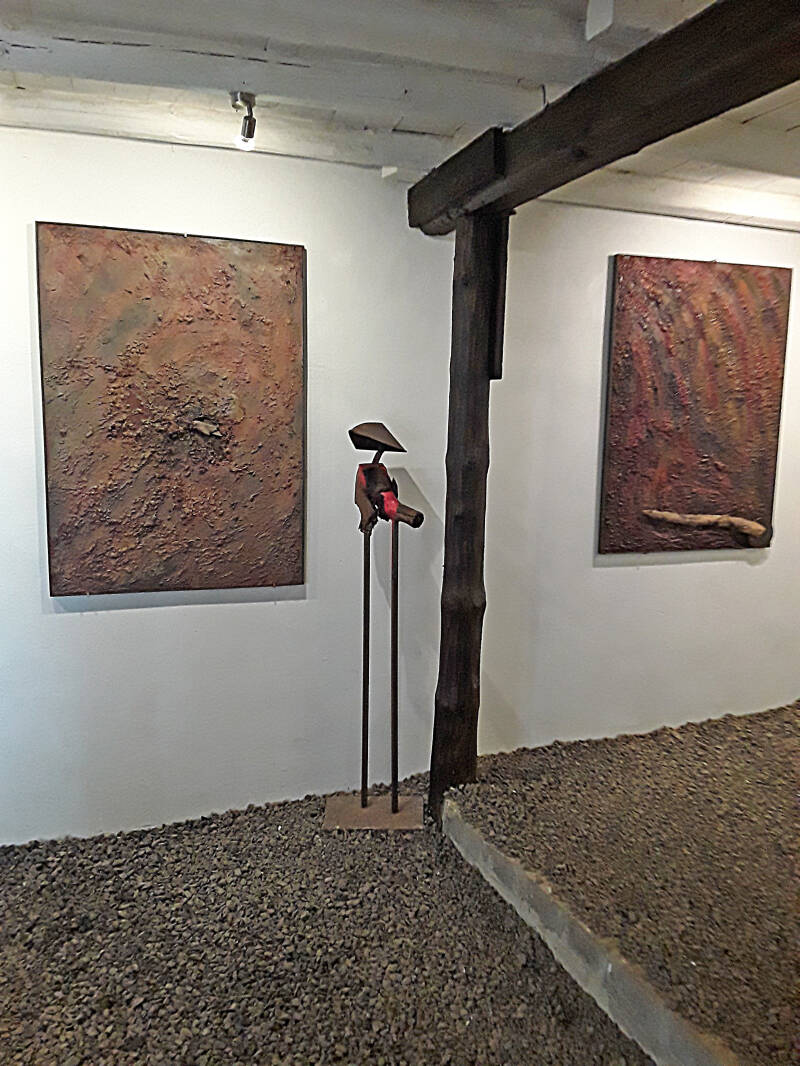 Materialbilder und Skulpturen prägen den unteren Ausstellungsraum.