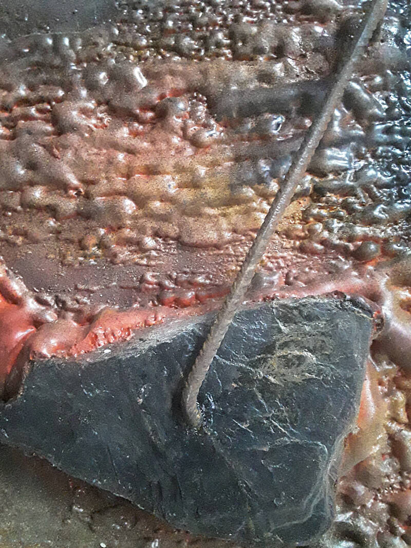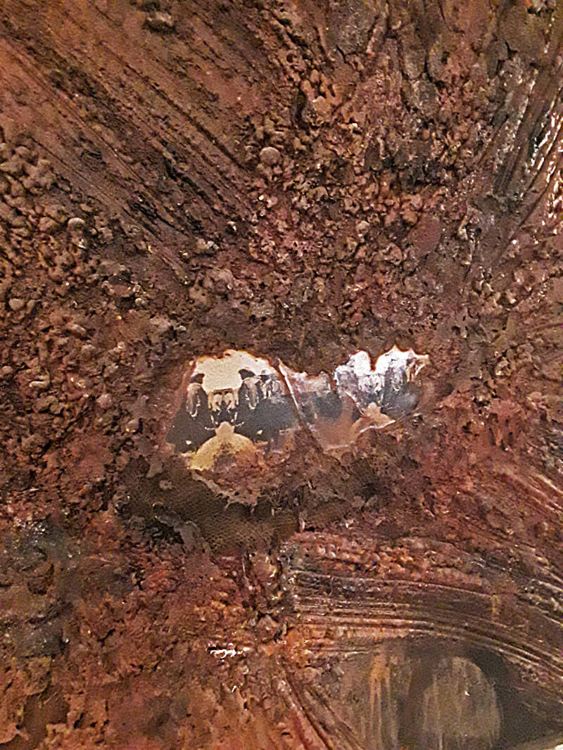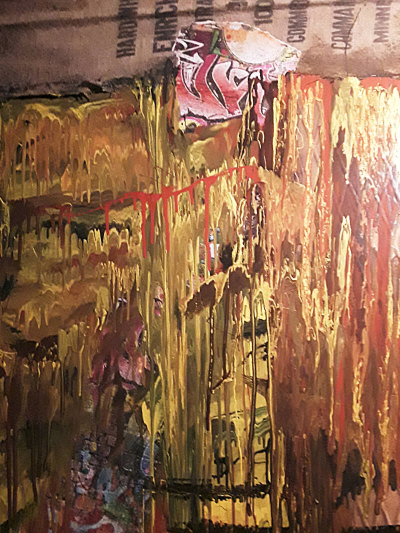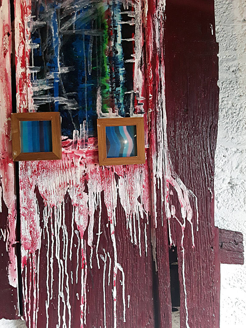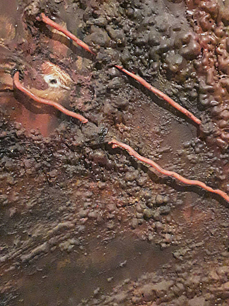 Materialbilder und Skulpturen prägen den unteren Ausstellungsraum.