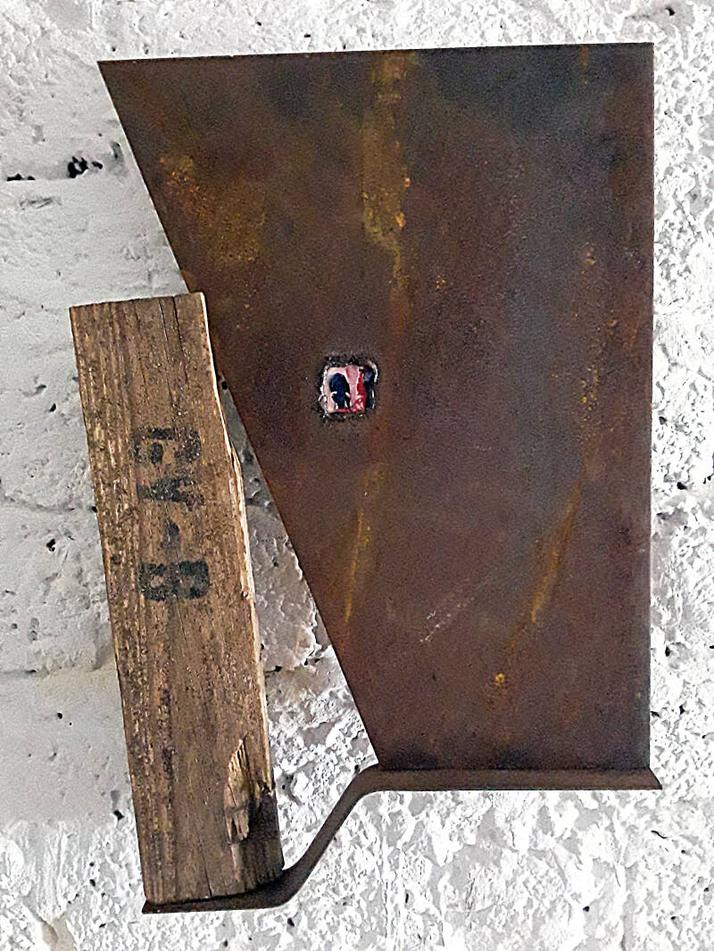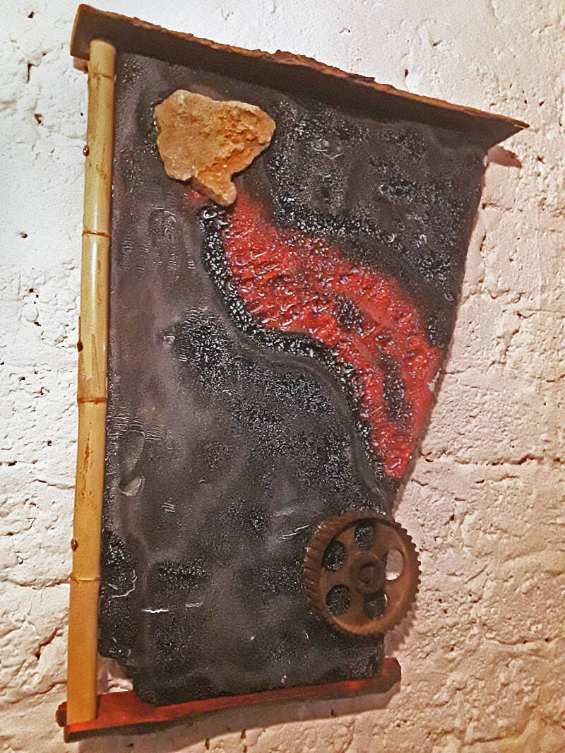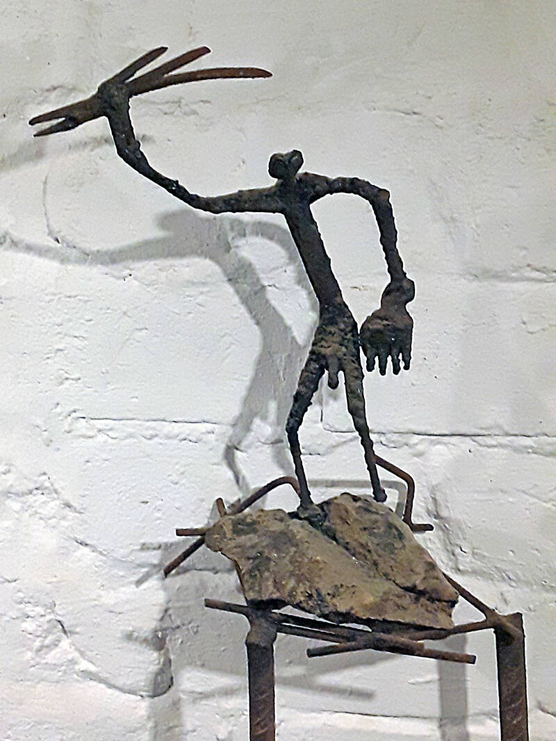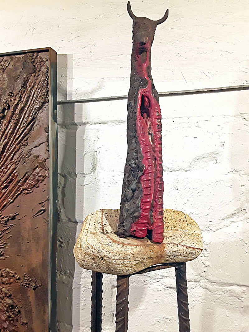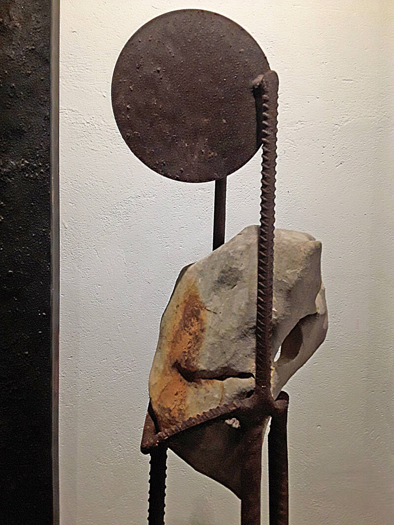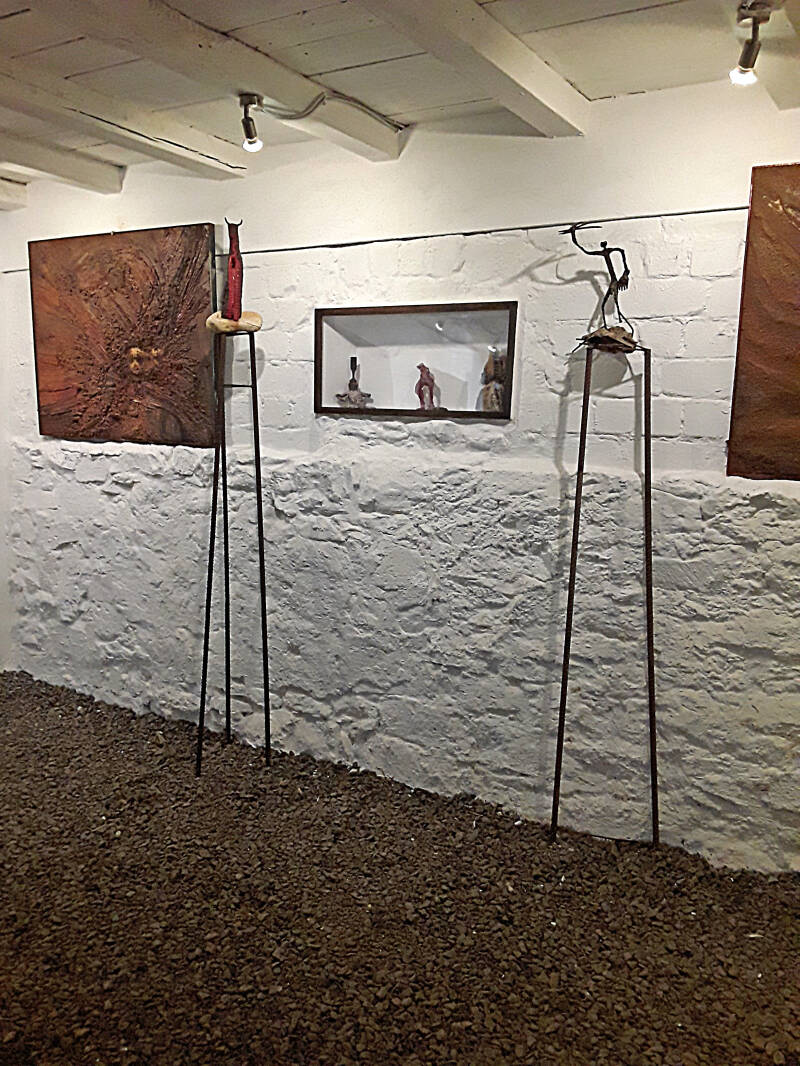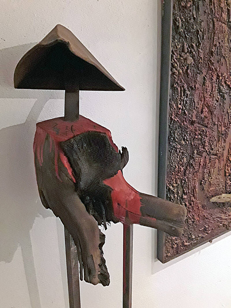 Gesammelt aus Fundstücken und aus verschiedenen Materialien, wie Holz, Eisen, Stoff und Stein bilden die Skulpturen und Materialbilder eine archaische Welt, die die Fantasie des Künstlers widerspiegeln und die Fantasie des Betrachters anregen sollen.