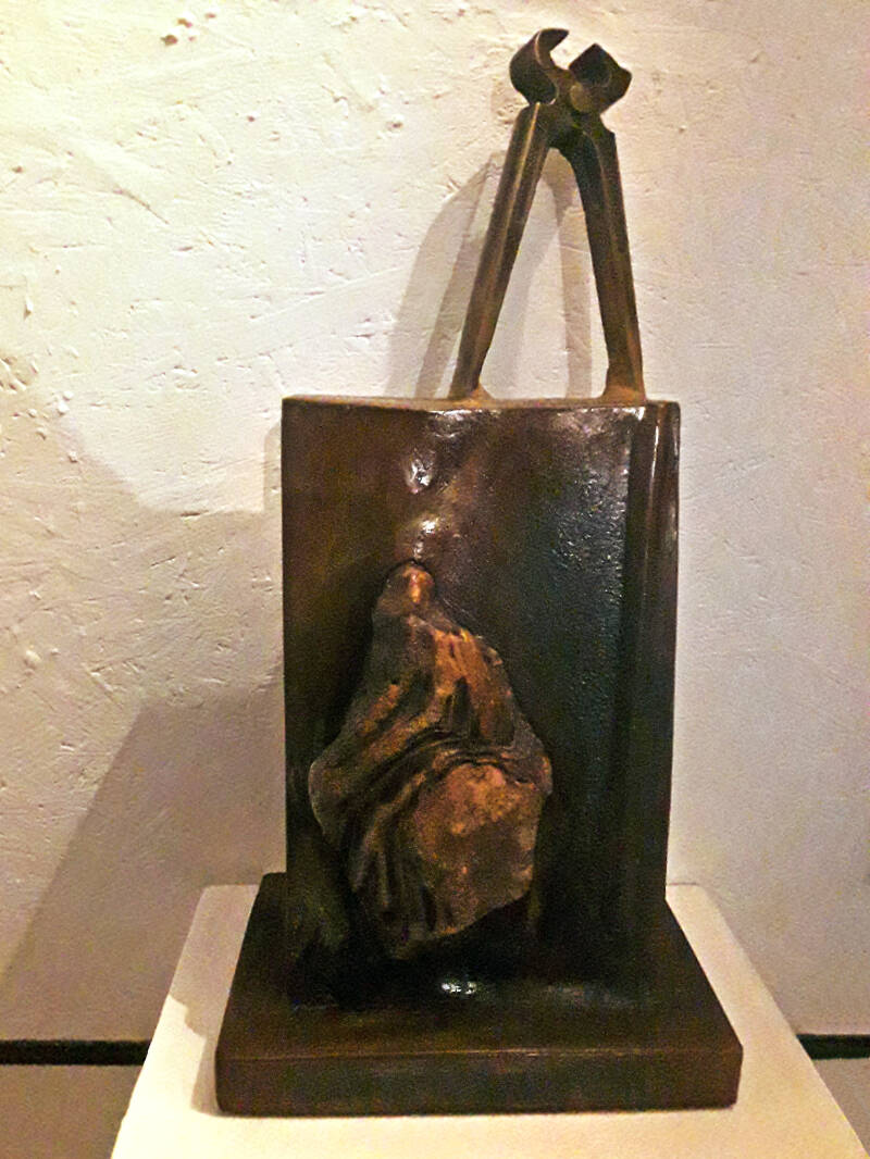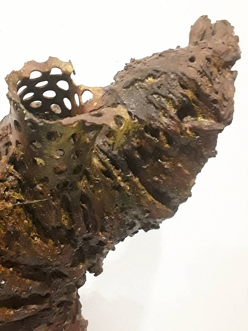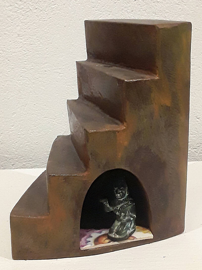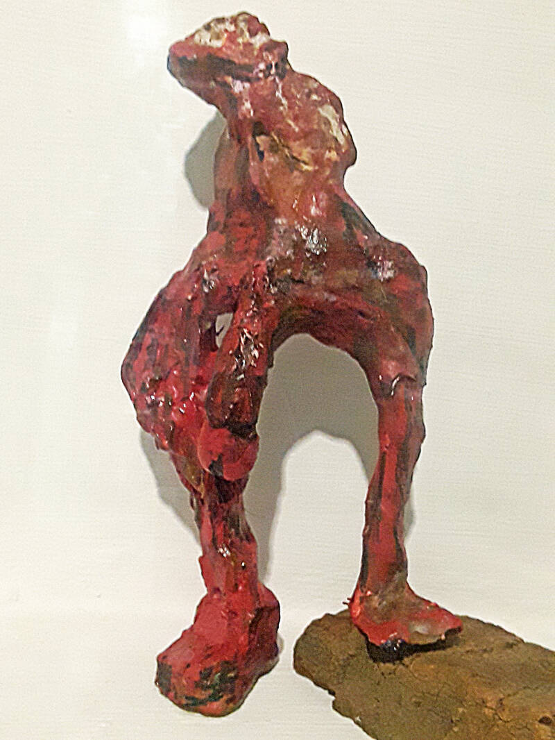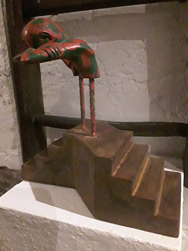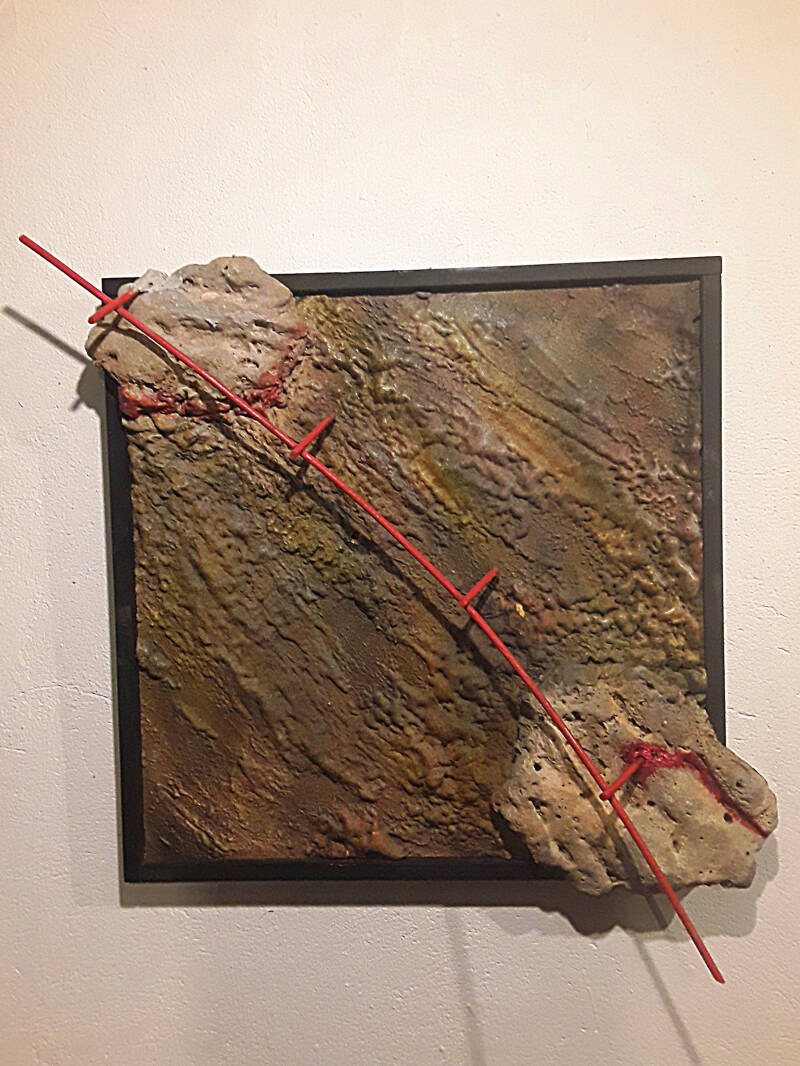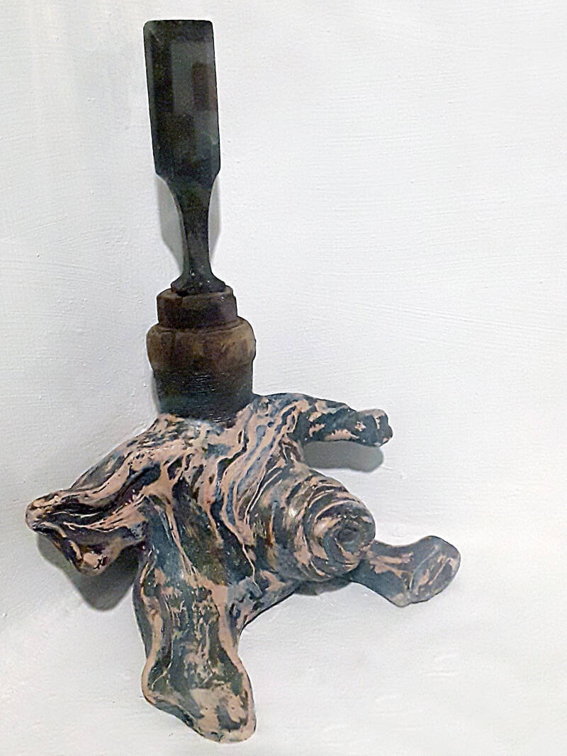 Gesammelt aus Fundstücken und aus verschiedenen Materialien, wie Holz, Eisen, Stoff und Stein bilden die Skulpturen und Materialbilder eine archaische Welt, die die Fantasie des Künstlers widerspiegeln und die Fantasie des Betrachters anregen sollen.